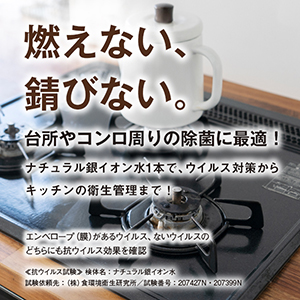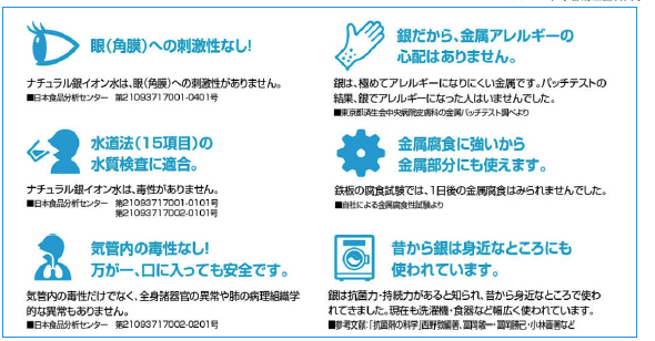 ナチュラル銀イオン水」は、高濃度(5ppm)の純銀イオン水であり、安全で、持続性の高い商品です。無臭・無色透明で、化学薬品・香料は不使用ですので、安心してご使用頂けます。
